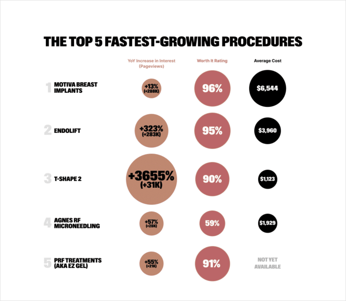 Pageviews jumped most dramatically for Motiva implants and Endolift laser skin tightening, a fast favorite for sculpting the jawline and chin.