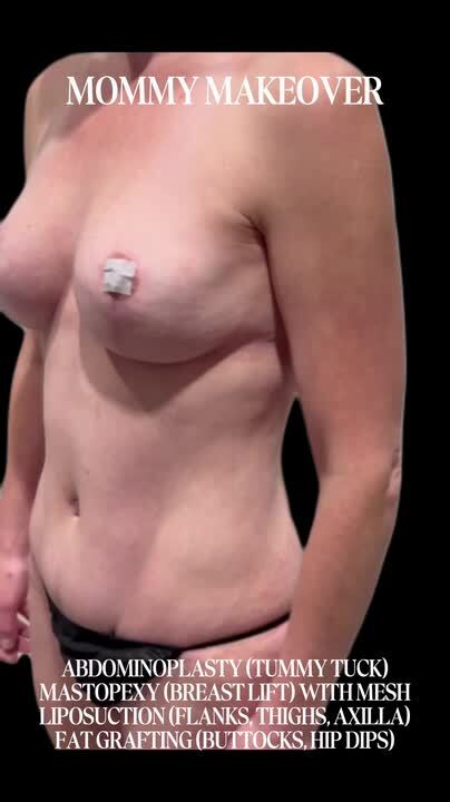 This patient underwent a comprehensive mommy makeover including a breast lift (mastopexy) with internal mesh support, abdominoplasty (tummy tuck), liposuction for contouring, and fat grafting to the buttocks and hip dips.