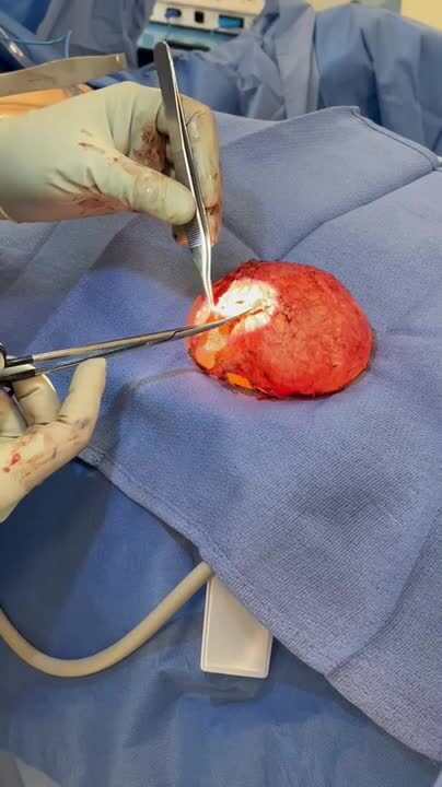 Total capsulectomy with explantation for grade 3-4 capsular contracture. Capsule opened on sterile back table shows relationship to implant.