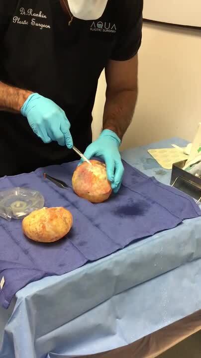 This patient had saline breast implants that were removed via an en bloc total capsulectomy. She initially presented with many symptoms of BII and horrible pain. As you can see, her capsules were very calcified and had an eggshell-like consistency.
