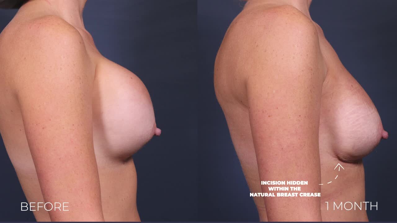 Our 41 year old patient underwent revision breast surgery after a traumatic hematoma from implants placed 16 years prior. The hematoma and capsule were removed, implants updated to cohesive silicone gel, and pockets adjusted to improve symmetry.