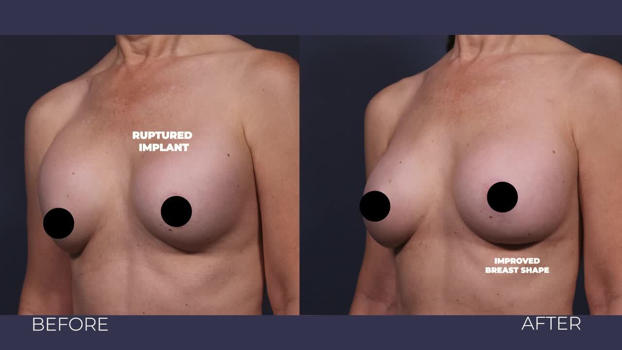Our patient had decades-old implants that ruptured with calcified scar tissue. We performed an en bloc capsulectomy and replaced them with cohesive silicone implants, improving shape and creating smoother, natural contours with well-healed incisions.