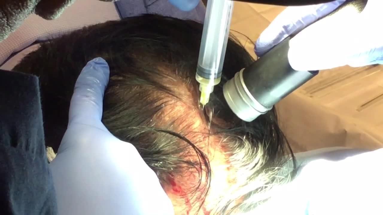 Male patient being treated for hair loss with PRP and done in office with no downtime. Patients will usually start seeing results after their third treatment. Treatments are recommended to be done one month apart from each other.