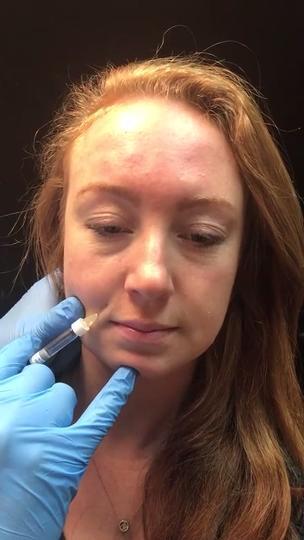 Dr. Burt Greenberg injects patient with FDA-approved dermal filler Restylane to patient's nasolabial folds adding volume to her face.