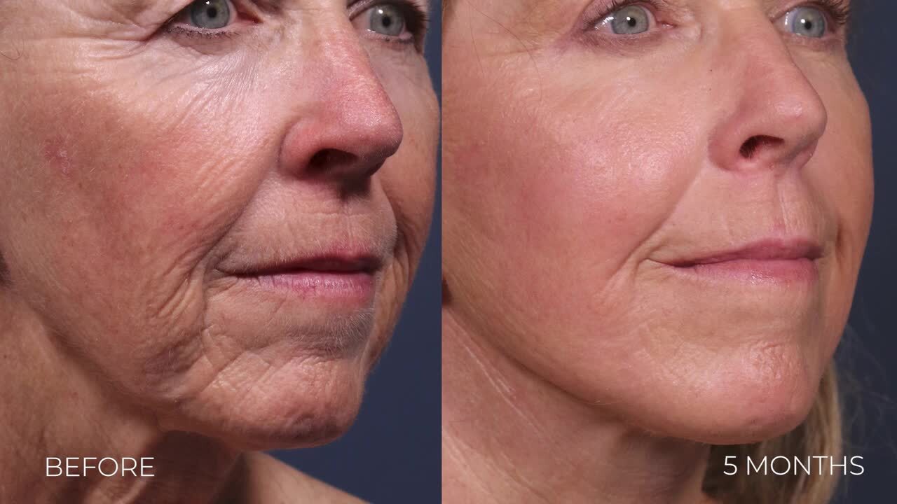 Five months after her traceless deep-plane face and neck lift, fractional CO? resurfacing, and upper-eyelid surgery, she looks naturally refreshed. Firmer contours, smoother skin, and brighter eyes give her a renewed, confident look.