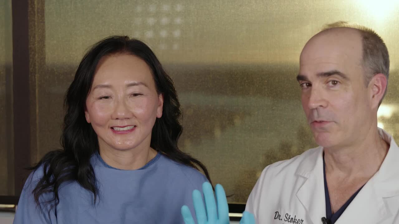 Our patient is a 60-year-old Asian female treated with upper & lower eyelid surgery to address genetic lower lid fat (“bags”) & excess upper lid skin and fat. At one month post-op, she shows smoother lower lids and improved upper lid definition.